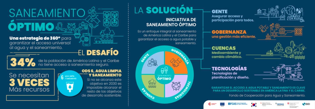 En el mundo todavía hay 3.600 millones de personas sin acceso a saneamiento seguro y para alcanzar todas las metas de saneamiento en 2030 se necesita una inversión de US$23 billones. En el Día Mundial del Saneamiento, destacamos cómo la iniciativa de saneamiento óptimo puede ofrecer una solución integral para América Latina y el Caribe y cómo se está apoyando desde el Fondo de Cooperación para Agua y Saneamiento. Las últimas estadísticas indican que un 34% de la población de América Latina y el Caribe no tiene acceso a saneamiento seguro y conseguirlo no es tarea fácil. Se necesitan tres veces más recursos de los disponibles. También se deben considerar variantes demográficas como: el constante aumento poblacional, la rápida urbanización y las poblaciones urbanas que viven en barrios marginalizados. Y, además, se deben considerar variantes medioambientales como la contaminación de las cuencas hídricas y el impacto del cambio climático. Sin embargo, garantizar el acceso universal a agua y saneamiento es clave (Objetivo de Desarrollo Sostenible 6), ya que sin esto es imposible cumplir el resto de los objetivos planteados para 2030. Por esto desde el Banco Interamericano de Desarrollo junto a la Agencia Española de Cooperación Internacional para el Desarrollo (AECID), a través del Fondo de Cooperación para Agua y Saneamiento planteamos la iniciativa de saneamiento óptimo. ¿Cómo funciona el saneamiento óptimo? El saneamiento óptimo pretende transformar el paradigma del saneamiento y cómo se atiende desde los servicios públicos, la ejecución de los proyectos y las herramientas de desarrollo del sector. Es un enfoque integral del saneamiento, que busca destinar más recursos y utilizarlos de forma más eficiente, priorizar los servicios de las poblaciones más vulnerables y reforzar los marcos políticos y normativos que inciden hoy en el acceso al agua y el saneamiento de la región. Para conseguir esto la iniciativa de saneamiento óptimo se enfoca en cuatro ejes: Población: Es clave priorizar a los que más lo necesitan, comprender cuáles son las necesidades de la gente y asegurar su participación en la gestión del saneamiento. Se está poniendo un foco especial en barrios marginales y espacios públicos. Y se está trabajando en aspectos como el cambio de comportamiento, la promoción de la higiene, la participación social, la conectividad al alcantarillado, y desarrollo local y empleo. Para esto, se está llevando a cabo un diagnóstico regional sobre servicios e higiene en asentamientos informales, además de otros priorizados en zonas críticas. Sumado a esto también hemos desarrollado pilotos de cambio de comportamiento en países como Costa Rica, Haití y República Dominicana y se están elaborando unas guías de conectividad tomando como referencia experiencias en Bolivia, Brasil o Perú. Gobernanza: otra de las claves es avanzar en políticas públicas que permitan desarrollar marcos sectoriales, planificación, normativas, legislación, esquemas de financiamiento y capacitación. Esto debe además ir complementado con esquema de de tarifas y subsidios del estado y con esquemas de participación con el sector privado. En este sentido, se ha realizado un análisis de marcos tarifarios y regulatorios en siete países de la región. Además de una guía de sostenibilidad financiera para proyectos de saneamiento y un estudio comparativo sobre desarrollo y aplicación de normativas vinculadas al sector de saneamiento en los 26 países de la región. También se está participando en las iniciativas de la AECID, el CEDEX y la CODIA referentes al refuerzo de la planificación sectorial y a la plataforma de debate sobre normatividad sectorial. Medioambiente, cuencas y cambio climático: El saneamiento hace parte del ciclo del agua y es fundamental integrarlo en la gestión de la cuenca. El tratamiento de aguas residuales es clave para la preservación de los cuerpos de agua y sus entornos, incluido los acuíferos, tema en el que se enfoca este año el Día Mundial del Saneamiento. El enfoque propuesto incide en la economía circular, potenciando el reúso de aguas residuales tratadas y lodos y la producción energética a partir de los gases emitidos en los procesos de tratamiento. También aborda cómo reducir la emisión de gases de efecto invernadero y cómo ser más resilientes a los efectos del cambio climático. Desde el Fondo hemos desarrollado estudios de casos sobre el reúso de agua residual tratada en América Latina y el Caribe, además de notas técnicas sobre el tratamiento de aguas residuales municipales. Sumado a esto, hemos trabajado junto a otras entidades internacionales en la promoción de una herramienta para medir el desempeño de la energía y las emociones de carbono en los sistemas de agua y saneamiento, llamado ECAM 3.0. Tecnologías: la innovación y uso de tecnologías es fundamental para la planificación, diseño y construcción de sistemas de saneamiento, así como para gestionar, operar y mantener los servicios. Para ello existe un campo interesante para el desarrollo y uso de softwares especiales, herramientas de inteligencia artificial y realidad aumentada. En cuanto a las tecnologías de saneamiento, se propone una mayor diversificación y una mayor apuesta por soluciones no convencionales, como es el alcantarillado condominial, las soluciones de tratamiento de aguas residuales basadas en la naturaleza, o el refuerzo de los sistemas de gestión para los lodos procedentes de soluciones individuales. Para potenciar estas herramientas y su uso, hemos desarrollado un software para diseño de alcantarillado, de ramales condominiales y de sistemas descentralizados de saneamiento, llamada SANIHUB. Esta plataforma tiene además en desarrollo otros módulos complementarios. Recientes estudios demuestran que América Latina y el Caribe se encuentra en camino de asegurar el acceso universal a agua potable y saneamiento. Sin 