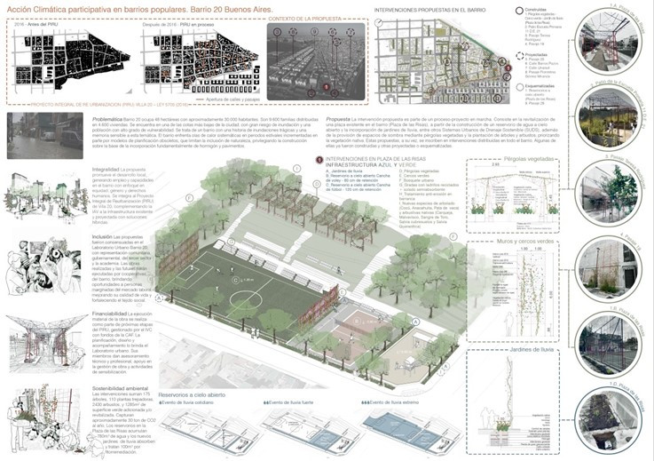 La intervención propuesta es parte de un proceso-proyecto en marcha. Consiste en la revitalización de una plaza existente en el barrio (Plaza de las Risas), a partir de la construcción de un reservorio de agua a cielo abierto y la incorporación de jardines de lluvia, entre otros Sistemas Urbanos de Drenaje Sostenible (SUDS), además de la provisión de espacios de sombra mediante pérgolas vegetadas y la plantación de árboles y arbustos, priorizando la vegetación nativa. Estas propuestas, a su vez, se inscriben en intervenciones distribuidas en todo el barrio. Algunas de ellas ya fueron construidas y otras proyectadas o esquematizadas.